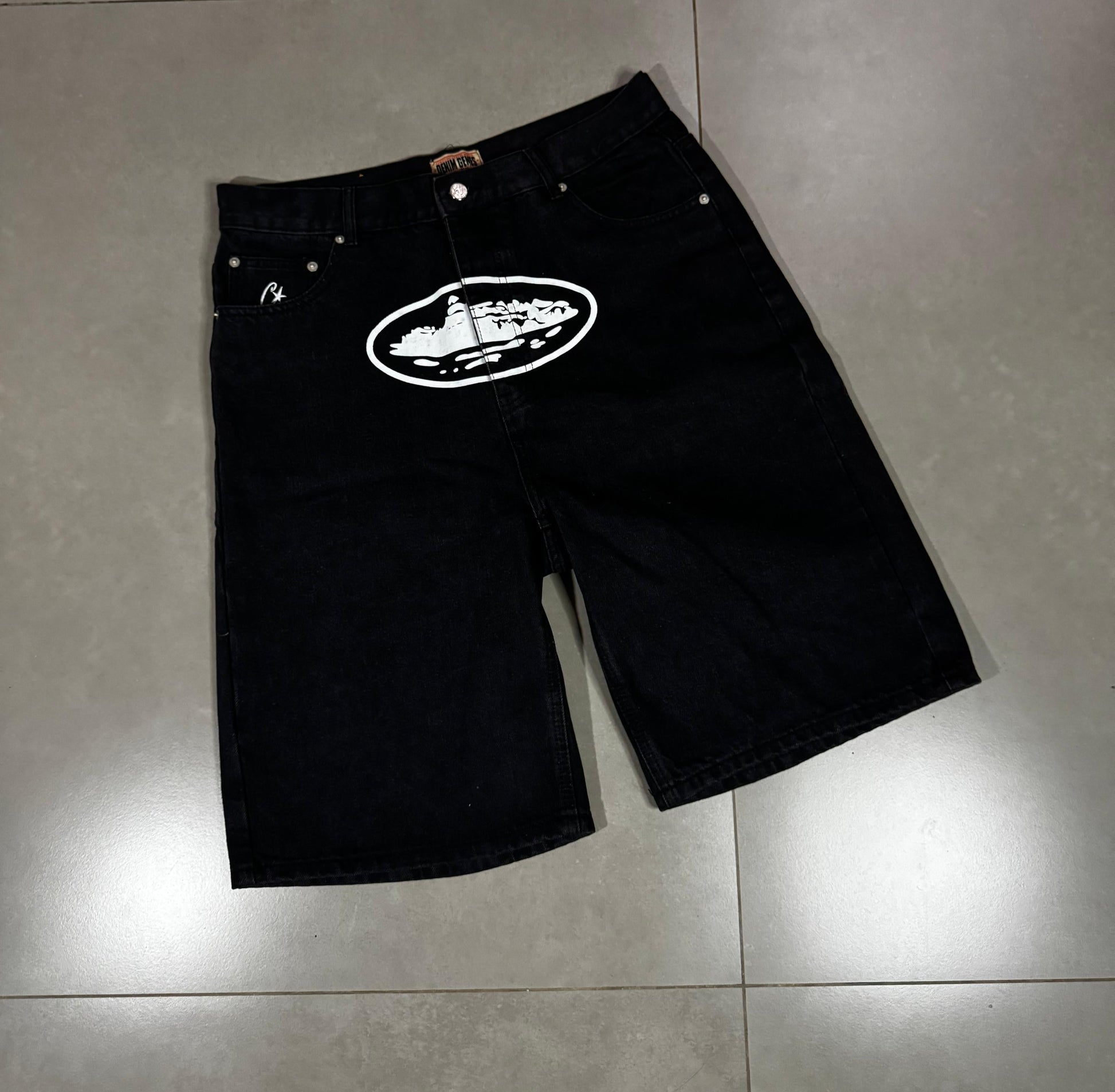 Shorts de denim preto com corte reto, tecido lavado de 14 oz, botões C-Star, bolso para moedas bordado e patch traseiro com logo Alcatraz.