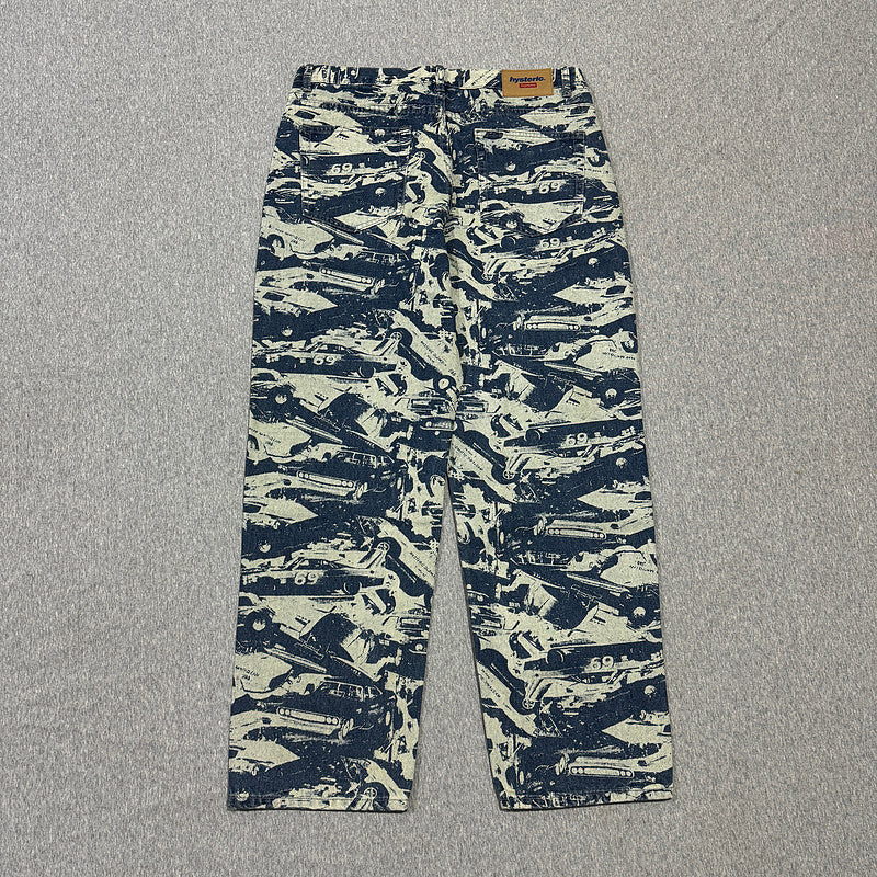 Eleve seu estilo com a Calça Jeans Baggy Supreme® Ft Hysterical Glamour Cars na cor Washed Indigo. O caimento solto e o estilo de perna larga a tornam perfeita para qualquer ocasião casual. A calça jeans é feita de algodão de alta qualidade com detalhes bordados e o logotipo da Supreme®.