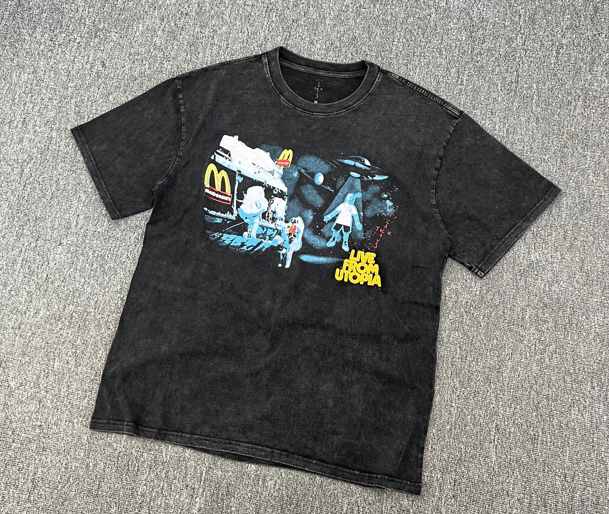 Esta camiseta vintage Travis Scott x McDonald's foi lançada como parte da parceria colaborativa das duas marcas em setembro de 2020. A camiseta Live From Utopia apresenta um gráfico de astronautas pegando o McDonald's no espaço enquanto uma figura de ação Travis Scott é abduzida por um OVNI ao lado. A camisa também apresenta as marcas pesadas de Cactus Jack e McDonald's ao lado da frase Live From Utopia.